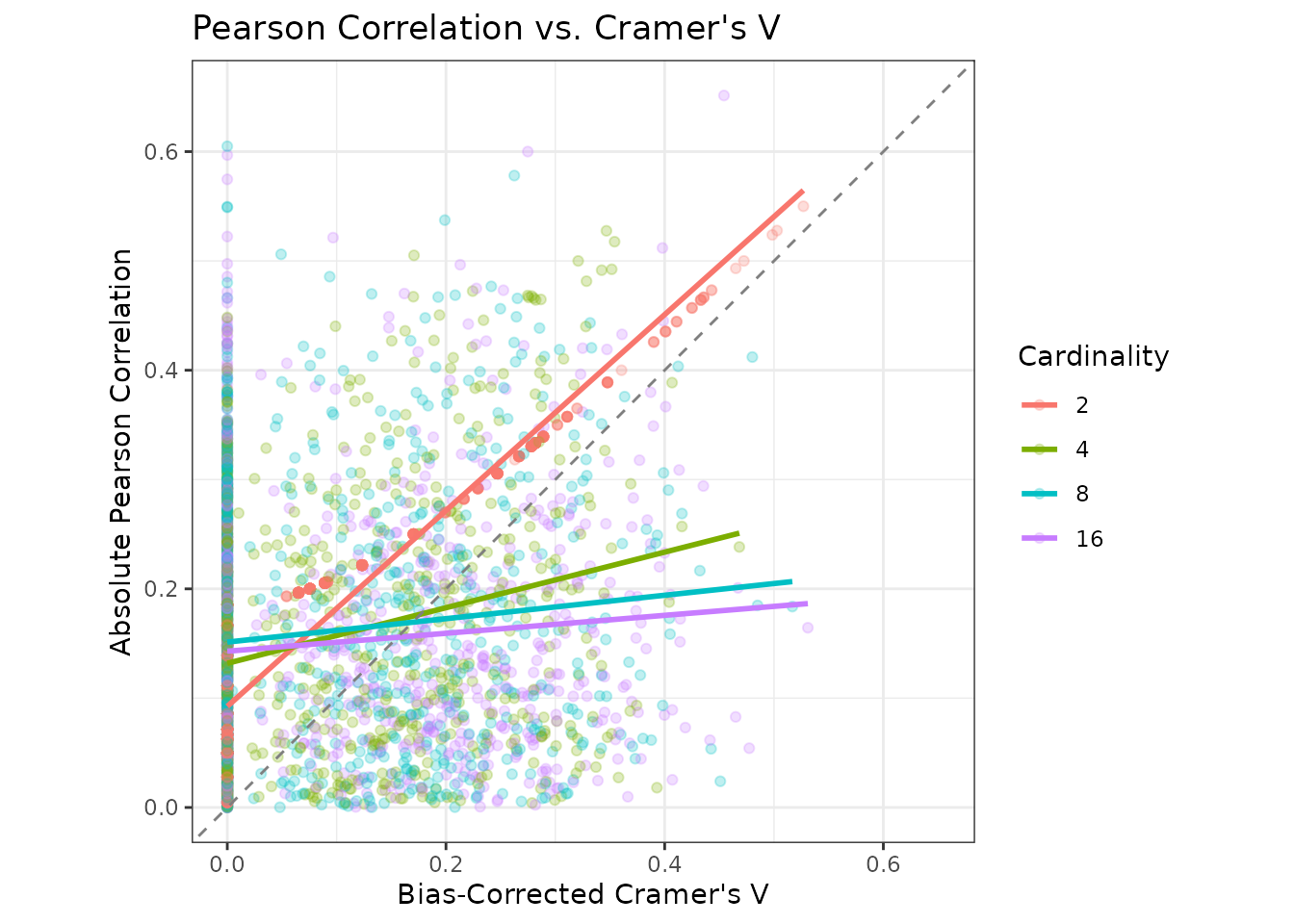 Notice how the relationship between Cramer’s V and Pearson correlation is tight for binary variables, but deteriorates rapidly as cardinality increases.