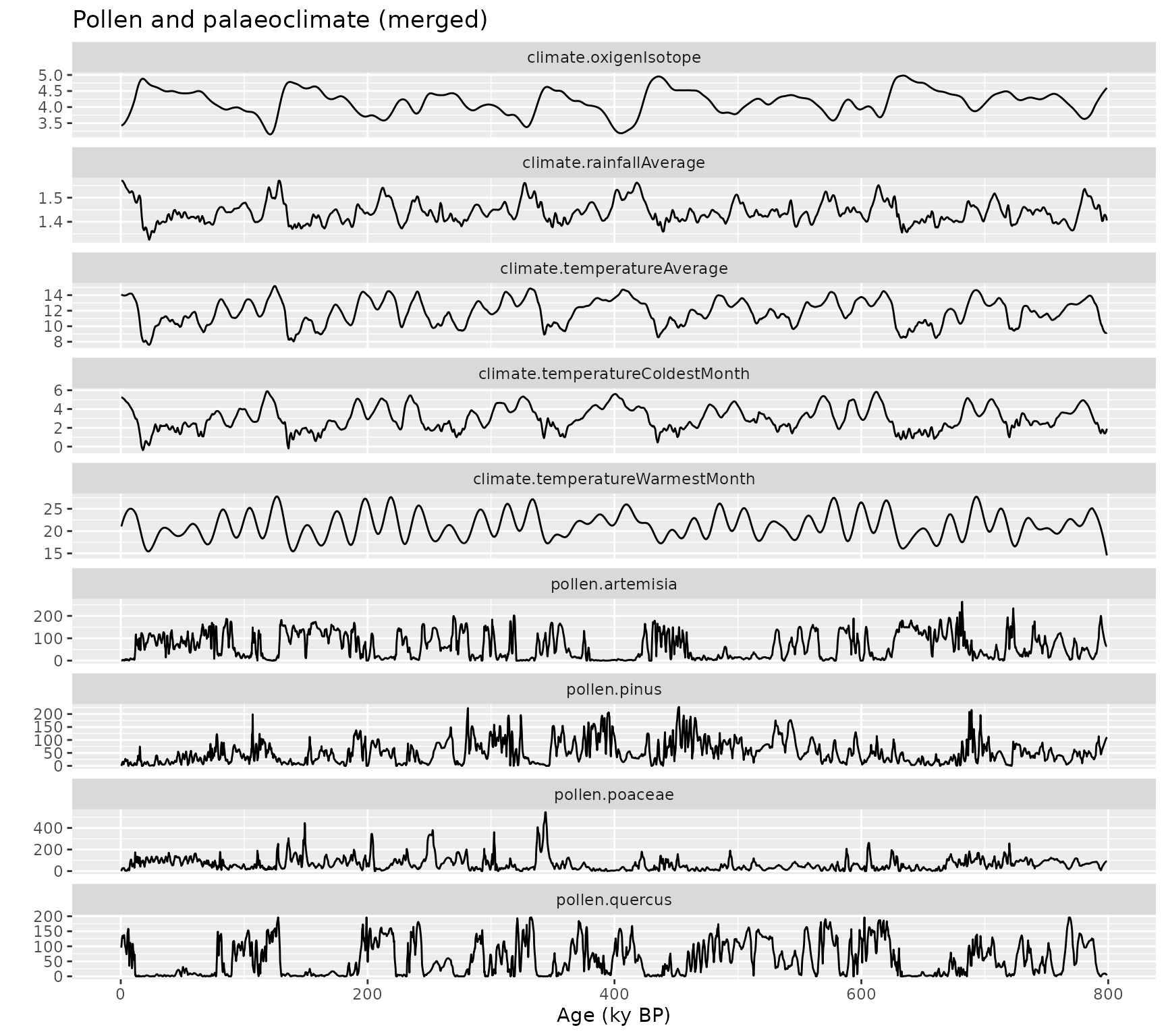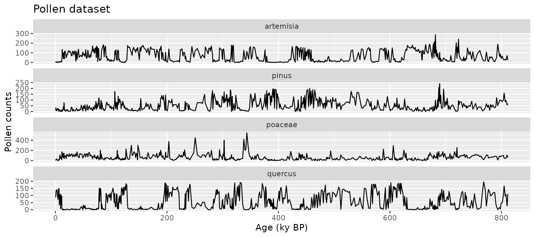 - pollen: 639 samples with four pollen types (Pinus, Quercus, Poaceae, Artemisia)