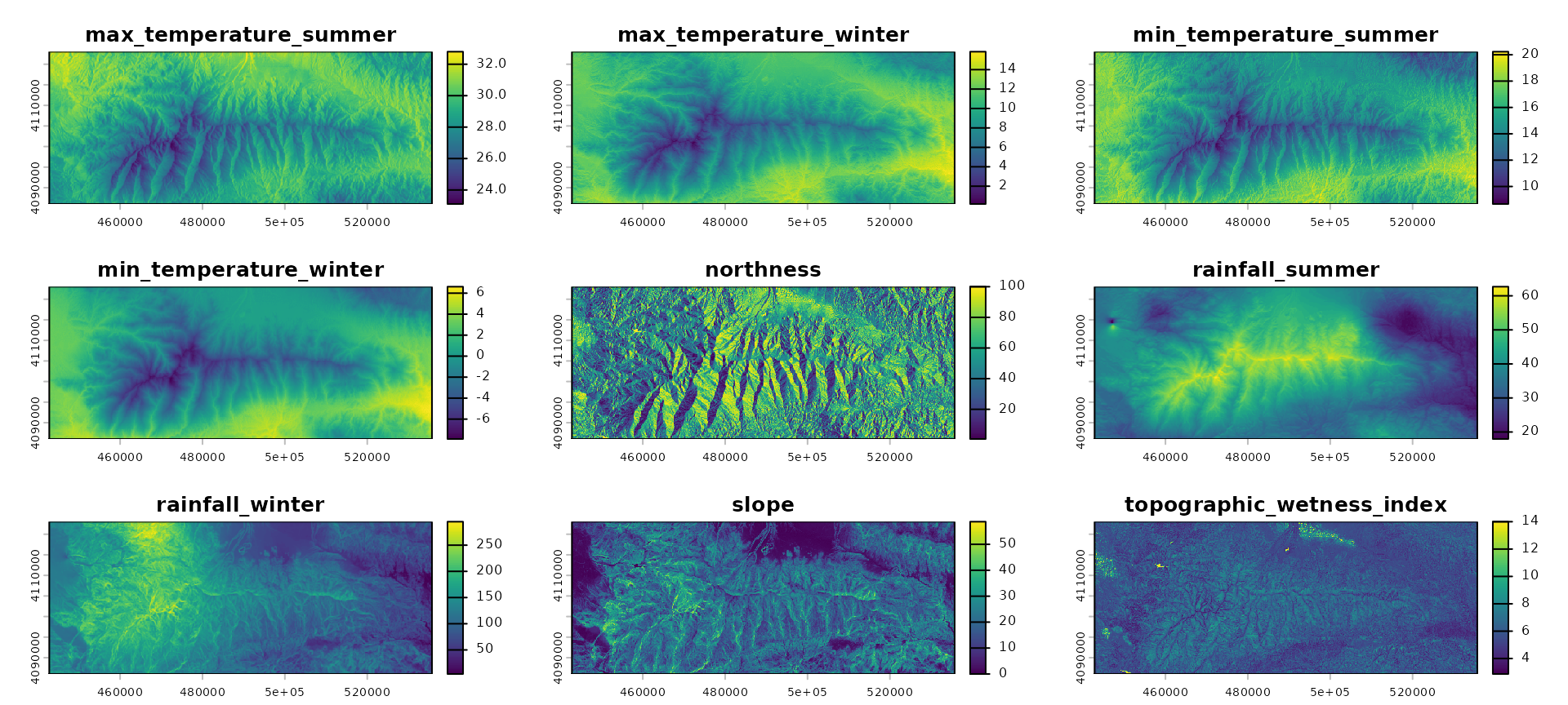 - Temporal climate scenario rasters: associated rasters for baseline (2010), 2050, and 2100 climate scenarios are available via download functions.