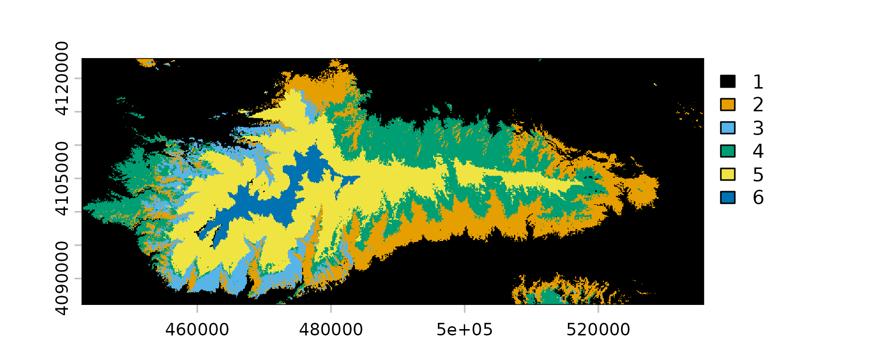 terra::plet(prediction_2100)Let’s transforme these pixels into a plot to get a better picture of changes in habitat suitability for each plant community.