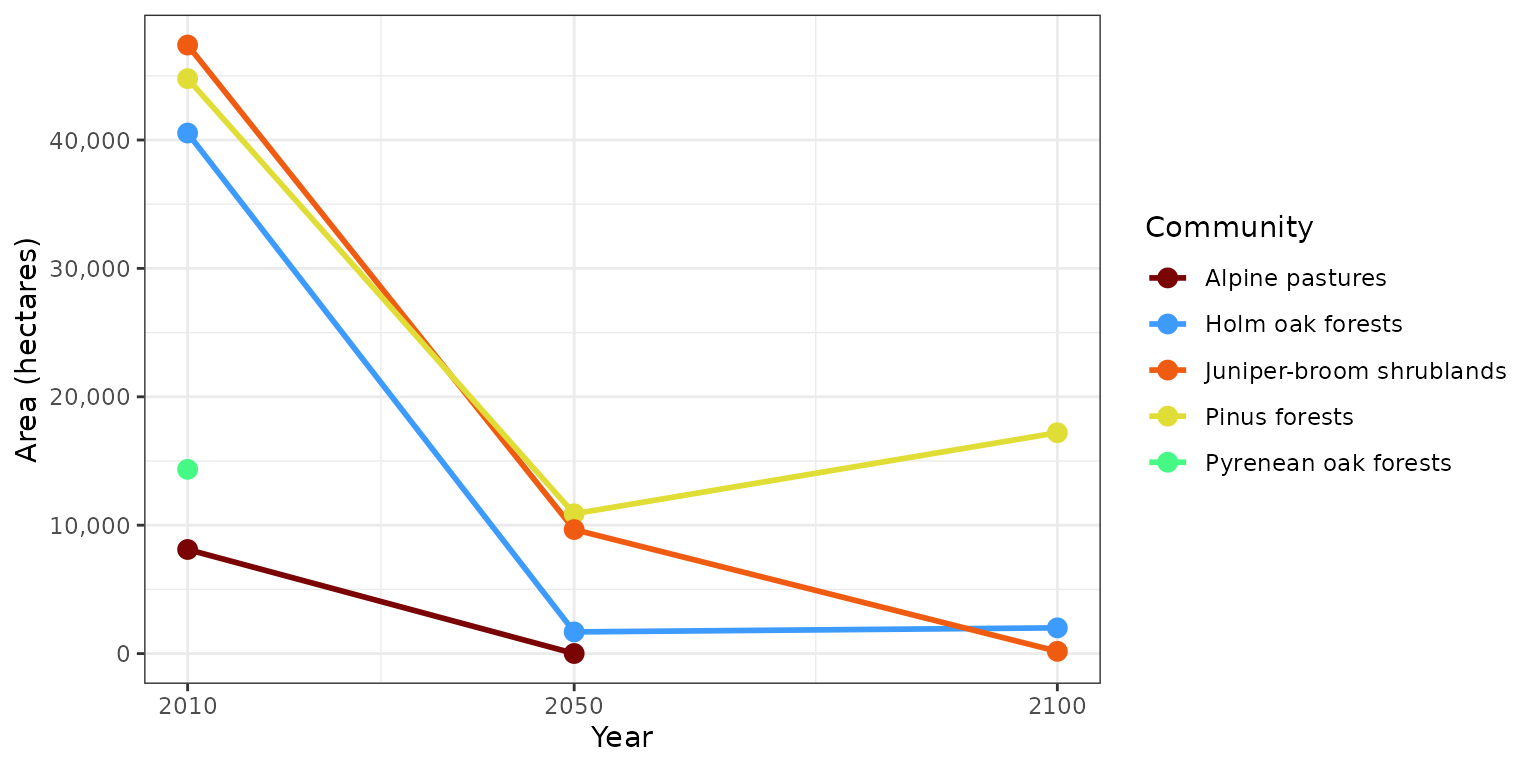 The number of pixels per plant community over time can be converted to hectares and plotted together to get a sense of how much the climate envelope of each community is going to shrink or expand in the future.