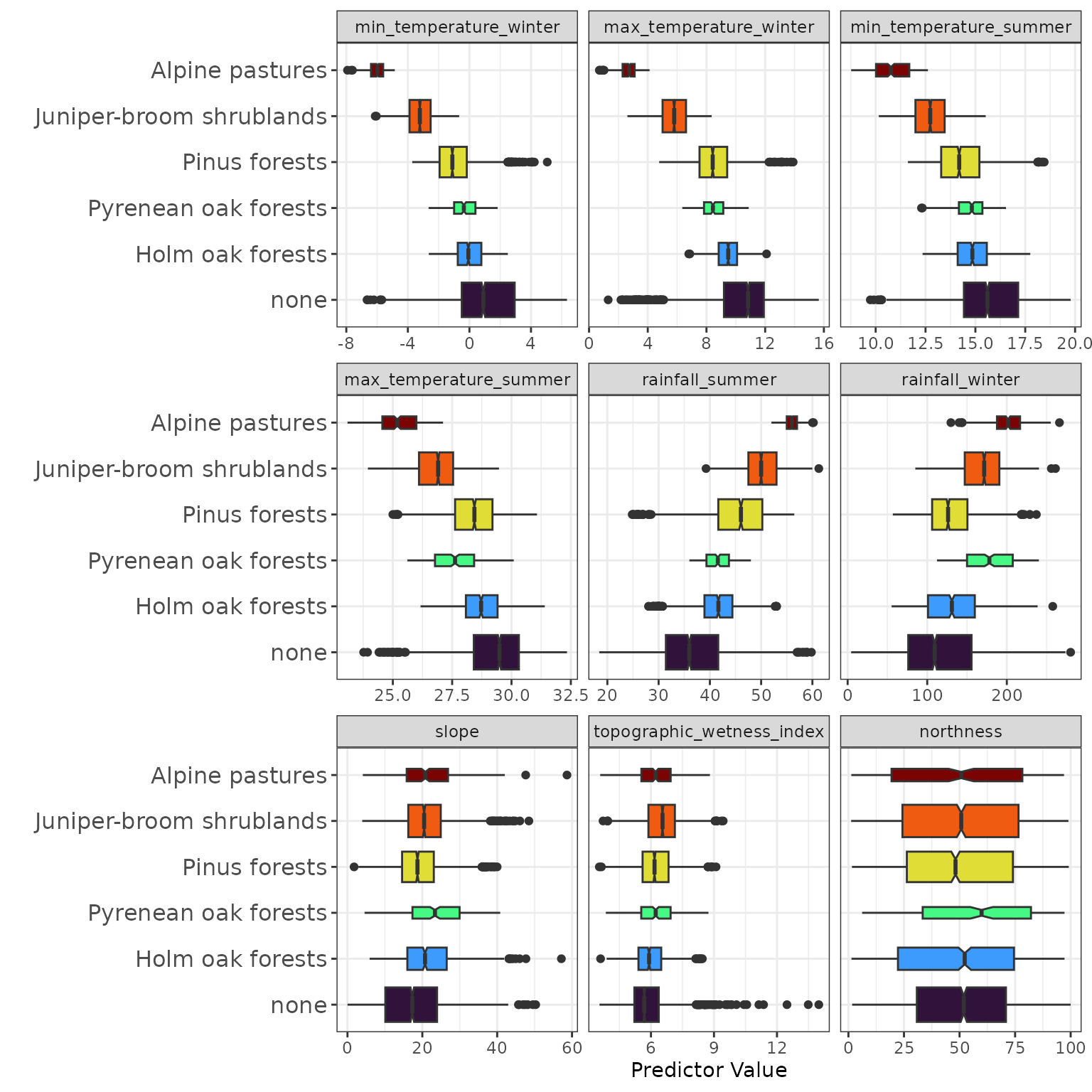 communitycolumn with 6 levels ("none"+ 5 named plant communities) and 5 binary presence-absence columns for individual community types. - Climate and topographic predictors: 9 numeric predictors spanning seasonal temperature extremes, rainfall, and terrain attributes.