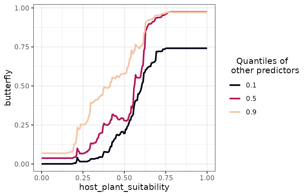 The response curves show a clear sigmoidal increase in butterfly suitability as host plant suitability increases, with little variation across the quantiles of the remaining predictors — consistent with an obligate dependency.