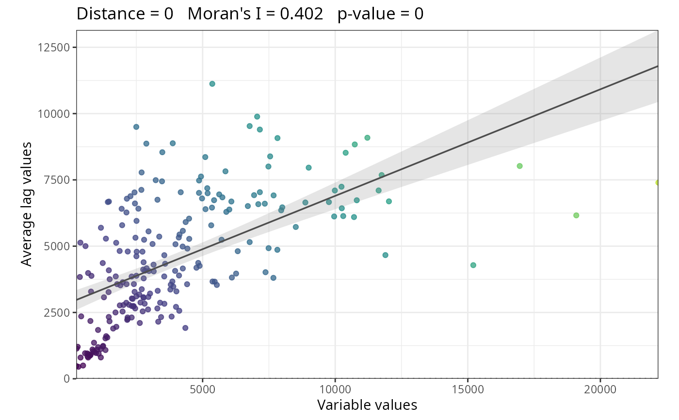 test: Data frame with observed and expected Moran's I values, p-value, and interpretation.plot: Moran's plot of the vector x against the spatial lags of x.plot.df: Data used in the Moran's plot.
